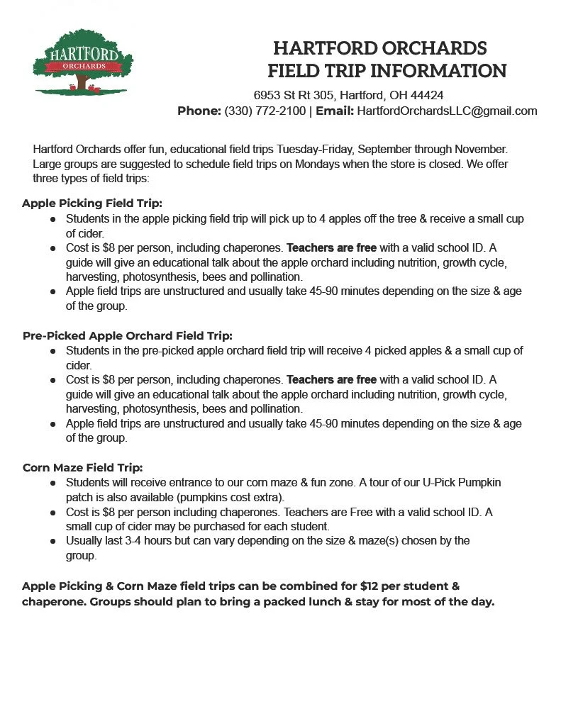 Hartford Orchards offers fun, educational field trips Tuesday-Friday, from September through October. There are three types of field trips offered: apple picking, pre-picked apples and a corn maze field trip. Read below for more info on our field trip packages. We welcome schools, girl/cub scouts, youth groups, 4-H clubs and all other types of organizations!