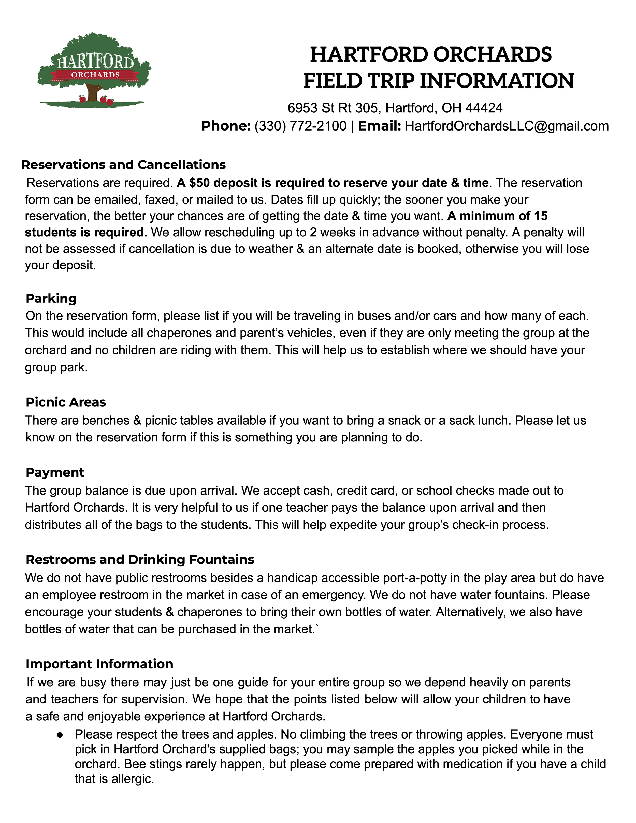 Reservations for field trips are required, along with a $50 deposit to reserve your date & time.